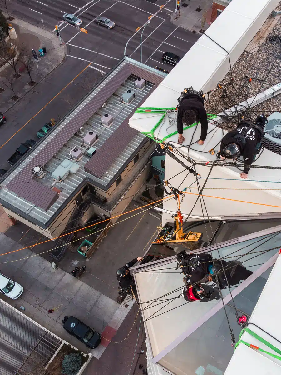 Xtreme Axis performs glass replacement using certified rope access technicians, which allows work to be completed: